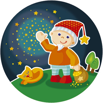 La Veilleuse Lutin des Rêves Haba se branche à une prise et projette un joli dessin du lutin des rêves au plafond.