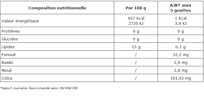 Le matin, avant le repas, déposer 3 à 5 gouttes de ce mélange au goût anisé sous la langue et laisser fondre.