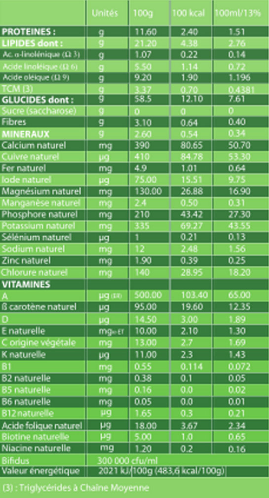 Farine de riz*, maltodextrines de maïs*, huiles végétales* non hydrogénées : colza* (origine France), noix de coco*, tournesol* (origine France), poudre d'amandes* mondées partiellement déshuilées (17%). Algues marines (0.56%) : spiruline (S. plantensis), laminaire (L. digitata, origine France). Calcium naturel d'origine végétale (L. calcareum, origine France), chlorure de calcium. Acides aminés essentiels : L-lysine, L-méthionine, L-cystéine. Bifidus maternis cultivé sur support 100% végétal et minéral. Acide L-ascorbique d'origine végétale, tocophérols naturels extraits de tournesol. Vitamines B1, A, D.