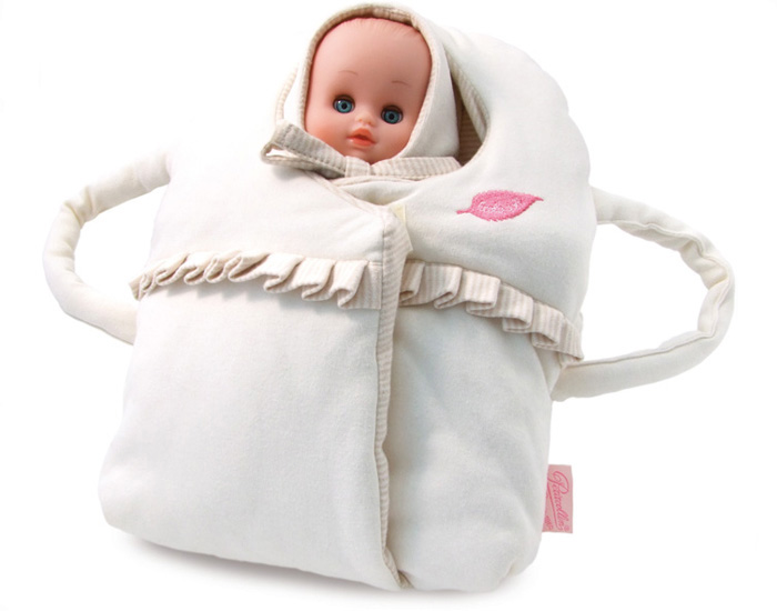 Le Bébé Petit Câlin est contenu dans un couffin en coton biologique muni de 2 anses pour le promener partout avec soi.