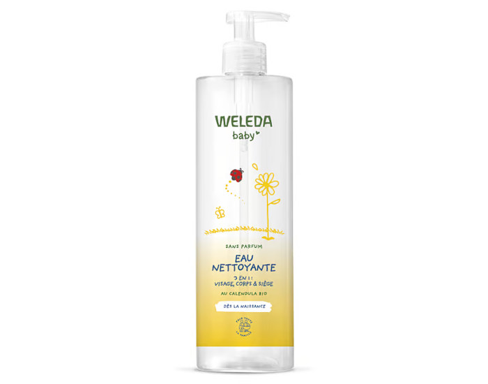 L'Eau Nettoyante Calendula Sans Parfum Weleda respecte la peau délicate de bébé sans irriter la peau. Ne pique pas les yeux. Protège du dessèchement et laisse la peau douce. À l’extrait de Calendula BIO. Formulée sans alcool et sans parfum.