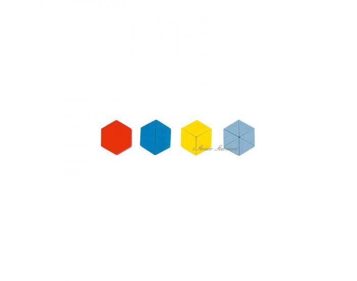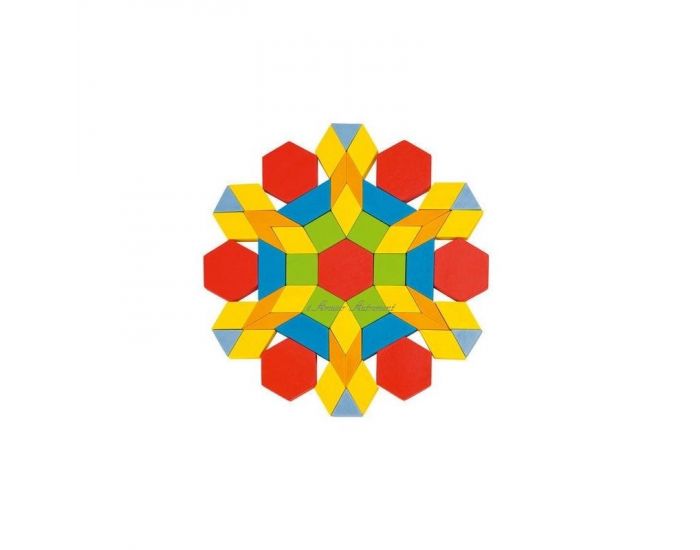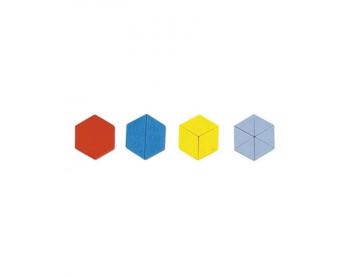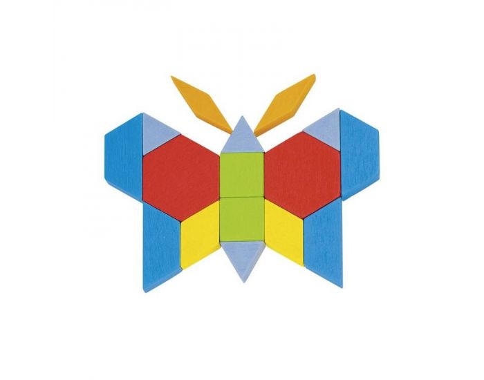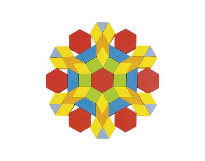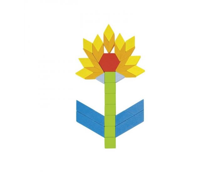 Baril contenant 250 pièces en bois coloré, de formes géométriques aux côtés identiques, pour imaginer et concevoir de fabuleuses figures.
