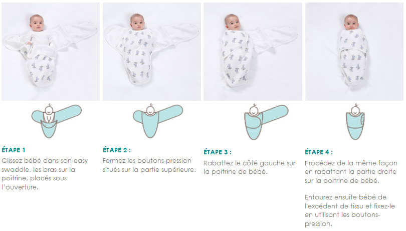 Chaque bébé est différent, mais le confort et la sécurité que les bébés emmaillotés ressentent sont universels. La beauté de l'emmaillotage réside dans sa simplicité. Pour les novices, il suffit d'un peu de temps et de patience pour être à l'aise avec la technique. Il n'existe pas de bonne ou de mauvaise façon d'emmailloter. Il vous suffit d'instituer une routine du coucher qui vous convienne, à vous comme à votre bébé et c'est tout !