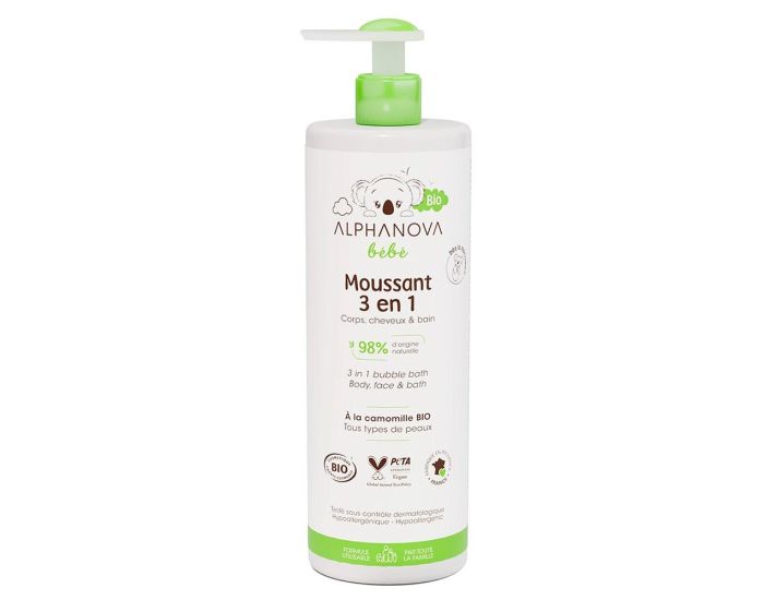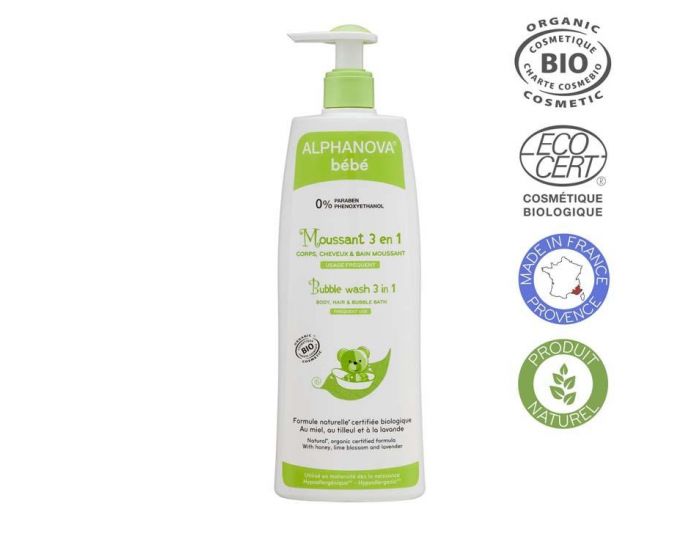 Corh2s, cheveux et bain moussant !Le moussant 3 en 1 est un gel lavant pour le corps, un shampooing et un bain moussant à la fois !Sa formule très douce, issue du savoir-faire provençal traditionnel, est riche en miel, en extraits de tilleul, de camomille et de lavande.Particulièrement adaptée pour apaiser bébé lors du bain du soir.Spécial bébé : sans savon, sans phenoxyethanol ni paraben.Hypoallergénique et certifié biologique.Conseils d'utilisation :Versez quelques gouttes dans la main, directement sur la peau, les cheveux mouillés ou dans le bain.Massez délicatement en faisant mousser.Rincez abondamment à l'eau.Bien sécher la peau de bébé et les plis cutanés.Utile en maternité, dès le naissance.Composition :Aqua, sodium coco-sulfate, anthemis nobilis flower water*, citrus aurantium amara flower distillate*, glycerin, lauryl glucoside, lavandula angustifolia flower water*, decyl glucoside, coco-glucoside, glyceryl oleate, saponaria officinalis extract, tilia cordata flower water*, mel, bisabolol, cocamidopropyl betaine, tocopherol, Parfum, sodium benzoate, potassium sorbate, hydrogenated palm glycerides citrate, citric acid.Cosmétique Ecologique et Biologique certifié par ECOCERT Greenlife.Selon le référentiel ECOCERT disponible sur http://cosmetiques.ecocert.com99.3% du total des ingrédients sont d'origine naturelle.*20% du total des ingrédients sont issus de l'agriculture biologique.Contenance :Flacon pompe de 500 ml. Fabricant :ALPHANOVA BEBE.Fabriqué en France (Provence)....