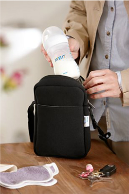 Le Sac Isotherme Thermabag Noir Avent peut contenir 2 biberons Avent, 2 tasses Magic Avent ou 4 pots VIA.