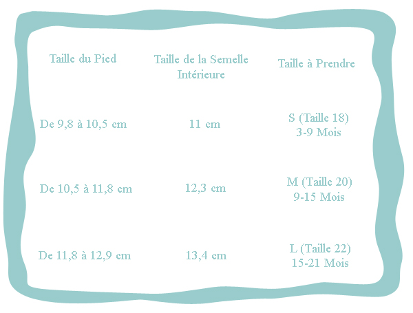 Les chaussons en cuir souples sont conçus de façon à épouser au mieux les pieds des tout-petits. Le fait de les voir grandir si vite peut nous amener à choisir la pointure supérieure. Cependant, afin qu'ils puissent marcher, courir, sauter et jouer à leur aise (sans difficulté ni chutes), il est vraiment préférable d'opter pour la pointure indiquée dans le tableau que vous trouverez ci-dessous.