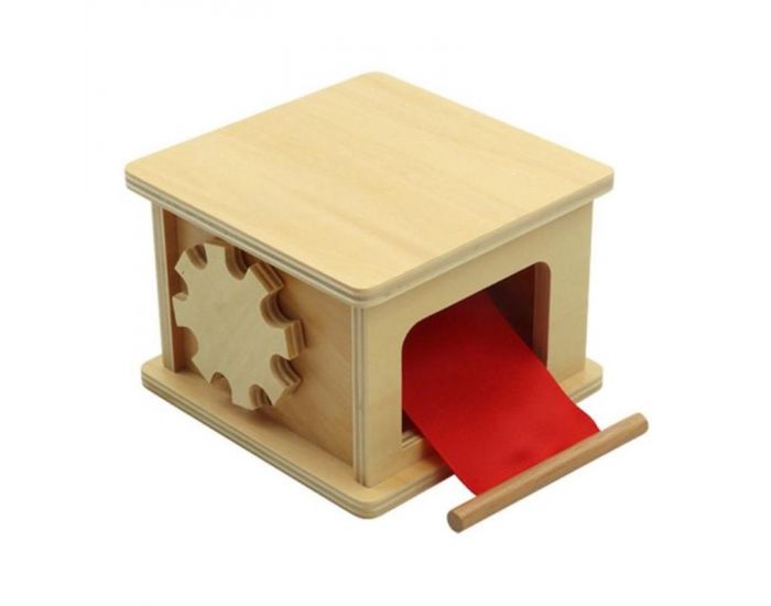La roue crantée sur le côté permet à l'enfant d'enrouler ou de dérouler le tissu.