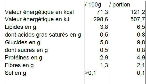Ingrédients : pomme de terre nouvelles*² (35%), courgette*² (34%), bouillon de cuisson, poulet* du Gaec Viguier Castanié (8%) (Origine France 12), huile d'olive* du Moulin Oliflix (ES).