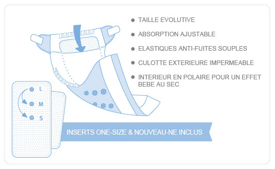 - Ajustez l'insert le plus grand à la taille de votre choix (S, M ou L) puis glissez-le à l'intérieur de votre couche. Si nécessaire ajoutez le second insert pour augmenter la capacité d'absorption de votre couche.