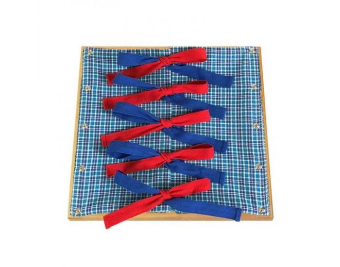 Fidèle à la pédagogie Montessori, les deux rectangles de tissu sont fixés sur les 2 cotés du cadre (et non pas enroulés autour!).