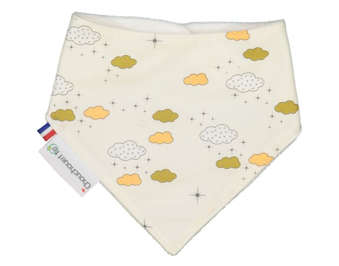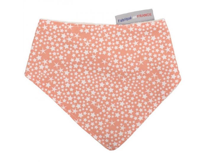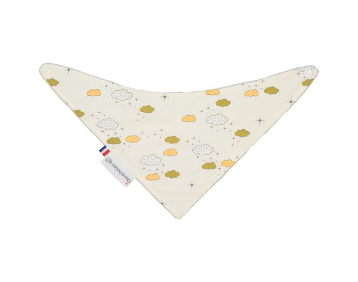 Il a une face en coton imprimé et une face en tissu doudou absorbant et surtout très doux pour le cou de Bébé. Il se ferme par une pression.