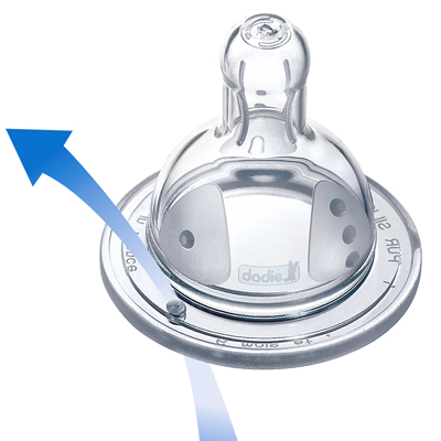 La tétine ronde 3 vitesses col large Dodie s'adaptent au rythme de succion de bébé.