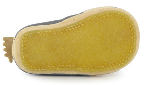 La semelle en patin crêpe est antidérapante, et en fait des chaussons dedans-dehors, elle permettra en effet de faire ses premiers pas dans le jardin ou sur la terrasse par temps sec. Le cuir est naturel et le tannage végétal.