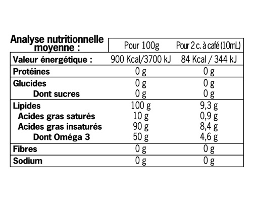 L'Huile Vierge de Lin - 25 cl Emile Noël est proposée dans un bouteille au petit format et à l'opacité qui vont protéger comme il se doit cette huile fragile. En effet, elle est très sensible à la lumière et instable, c'est à dire qu'elle s'oxyde si elle n'est pas consommée rapidement. C'est pourquoi il est vivement conseillé de la maintenir au réfrigérateur après ouverture et de l'utiliser dans les trois mois qui suivent.