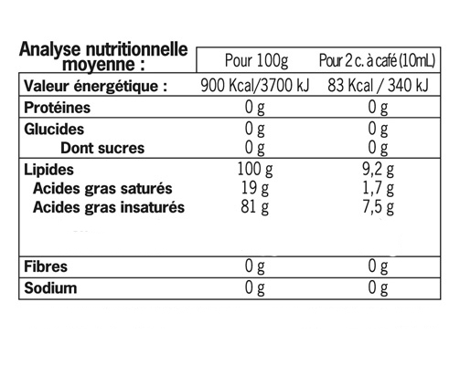 Cette huile teintée d'une jolie couleur orangée et offrant un subtil goût de céréales sera parfaite crue, en filet sur vos salades et crudités ou en sauce.