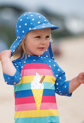 La Casquette Bébé Protège Nuque Rayures Marines Frugi, est un accessoire indispensable pour le printemps et l'été.