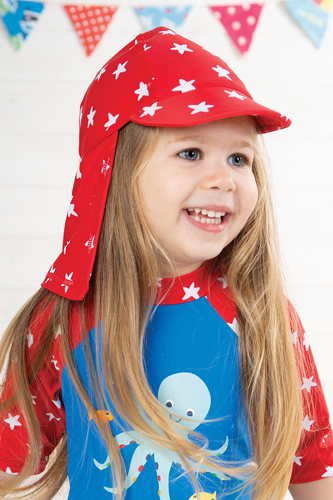 La Casquette Bébé Protège Nuque Rouge Etoiles Blanches Frugi, est un accessoire indispensable pour le printemps et l'été.