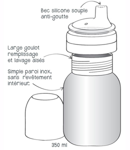Cette gourde n'est pas isotherme et ne passe pas au micro-ondes. Elle est compatible avec certaines tétines (biberon large goulot).
