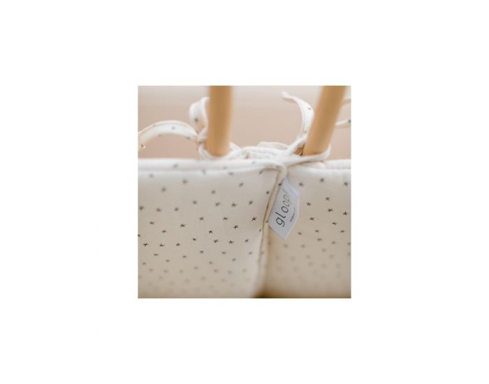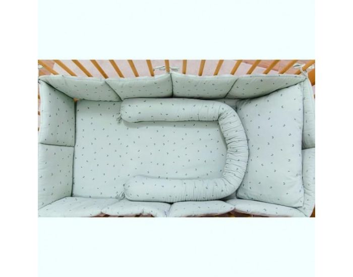 Ce tour de lit complet fait la totalité du tour d'un lit de 60x120 (taille standard pour un lit bébé). Il s'attache aux barreaux du lit grace aux paires de nouettes prévues à cet effet.