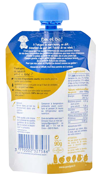 La Gourde Brassé Banane Fleur d'Oranger - 90g - Dès 6 mois Good Goût offre un délicieux et parfait équilibre entre du brassé, de la purée de fruits et des céréales. Good Goût a pour objectif de proposer des listes d'ingrédients très courtes, parce que c'est la qualité qui prime avant tout et que chaque composant est choisit ave le plus grand soin.