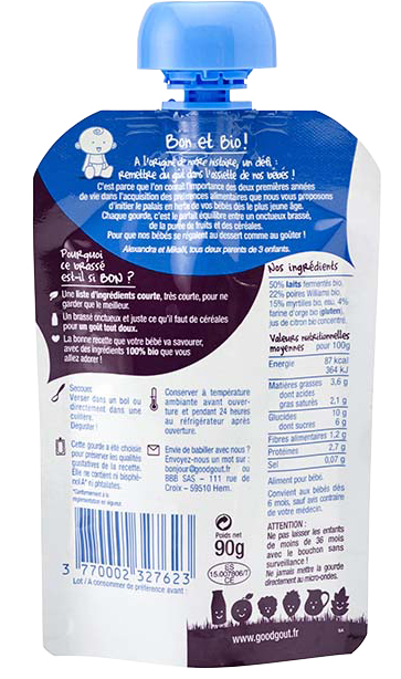 Ingrédients : 50% lait fermenté bio, 22% poires William bio, 15% myrtilles bio, eau, 4% farine d'orge bio (gluten), jus de citron bio concentré.