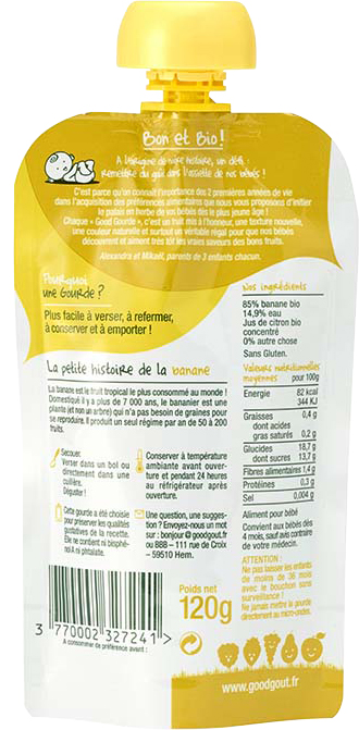 La Gourde de Fruit Banane pour Bébé Good Goût c'est : 85% de bonnes bananes, un peu d'eau, une goutte de jus de citron et rien d'autre !