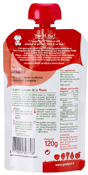 La Gourde Fraise et Banane Good Goût c'est : 55% de bonnes fraises, 45% de bananes bio, un peu d'eau, une goutte de jus de citron et rien d'autre !