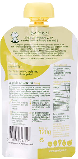 La Gourde Pomme et Coing Good Goût c'est : 65% de bonnes pommes Gala, 35% de coings bio, un peu d'eau, une goutte de jus de citron et rien d'autre !