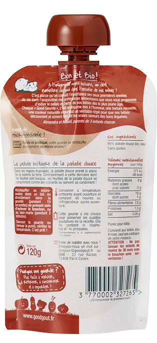 La Gourde de Légumes Patate Douce pour Bébé Good Goût c'est : 95% de bonnes patates douces bio, un peu d'eau, et rien d'autre !