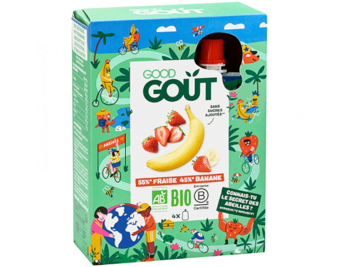Les Gourdes Fraise Banane Good Goût Kidz c'est 55% de bonnes fraises, 45% de bananes, une goutte de jus de citron et rien d'autre !