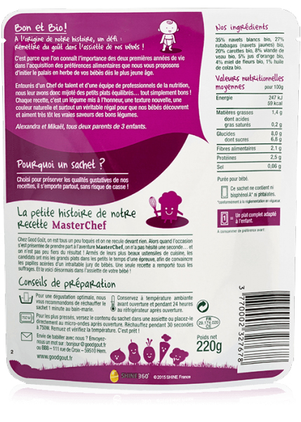 Le Petit Plat Masterchef pour Bébé Navets Carottes Veau Good Goût c'est : 62% de bons navets, un peu de carottes, juste ce qu'il faut de viande de veau, un soupçon de jus d'orange et de miel, et rien d'autres !