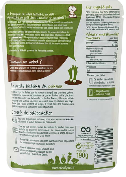 Le Petit Plat pour Bébé Fondue de Poireaux Pommes de terre Cabillaud Good Goût c'est : 56% de bons poireaux bio, 20% de bonnes pommes de terre bio et 8% de chair de cabillaud MSC (pêche durable), juste ce qu'il faut de crème fraiche bio, un soupçon de curry bio et rien d'autre !