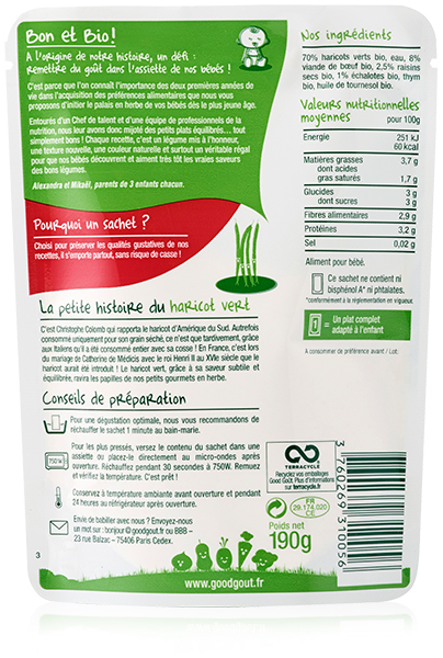 Le Petit Plat pour Bébé Haricots Verts-Boeuf Good Goût c'est : 70% de bons haricots verts, juste ce qu'il faut de viande de boeuf, des raisins secs, un peu d’échalotes, une pointe de thym, de l'huile de tournesol et rien d'autre!