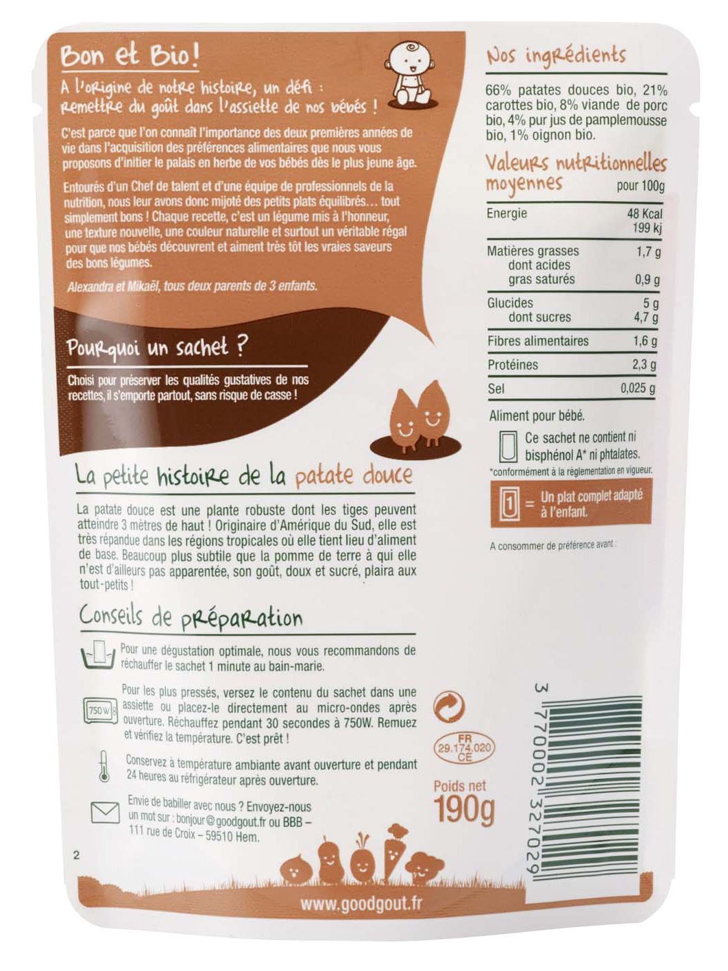 Le Petit Plat Bébé Patate Douce-Sauté de Porc Good Goût c'est : 66% de bonnes patates douces, un peu de carottes, juste ce qu'il faut de sauté de porc, une touche d'oignon, un soupçon de jus de pamplemousse, et rien d'autre !