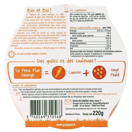 Le Petit Plat pour Bébé 220 g Boeuf Carottes Orge Perlé Good Goût c'est : De délicieuses carottes, juste ce qu'il faut de viande de boeuf, de l'orge perlé gourmand, une touche de baie de genièvre, et rien d'autre !