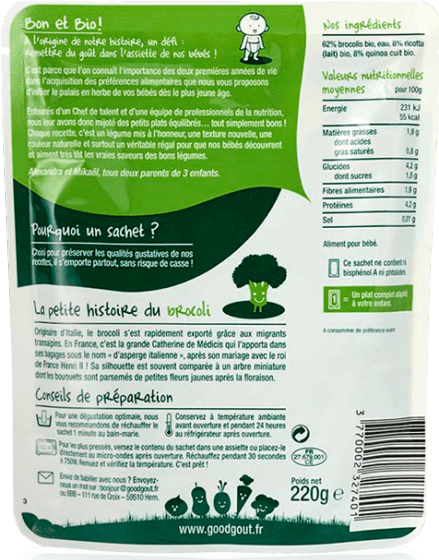 Le Petit Plat pour Bébé Brocolis Quinoa Ricotta Good Goût c'est : 62% de bons brocolis bio, du quinoa, juste ce qu'il faut de ricotta, un peu d'eau, et rien d'autre !