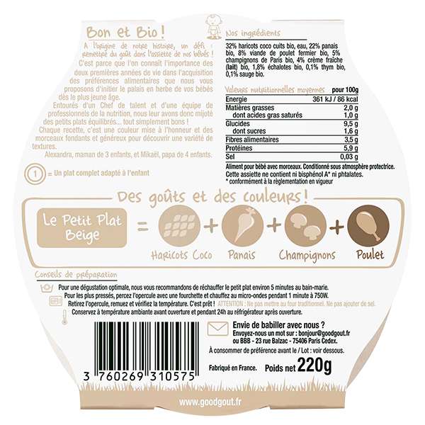 Le Petit Plat pour Bébé Haricot Coco Poulet Champignons Good Goût c'est : des haricots coco, du panais, juste ce qu'il faut de poulet fermier, des champignons de Paris, une pointe de crème fraîche, une touche d'échalote, de thym et de sauge, et rien d'autre !