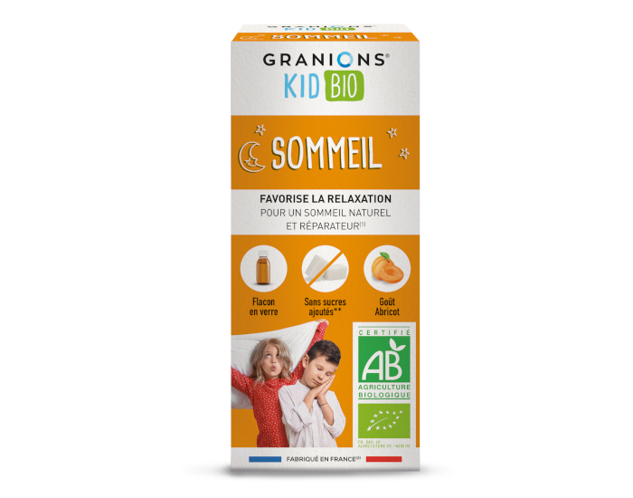 La Solution Buvable aux Plantes Bio Sommeil Granions Kid Bio, au bon goût d'abricot, est une formule complète à base d’extraits de plantes bio : fleur d’oranger, camomille, tilleul, verveine, eschscholtzia et passiflore.
