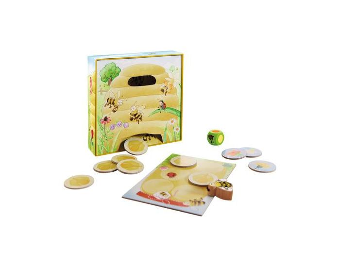 Contient 1 ruche (= plateau inséré et fond de la boîte), 1 abeille Abella, 10 plaquettes de fleurs, 1 pot de miel (= plateau de dépôt), 1 dé, 1 règle du jeu. De 1 à 4 joueurs, à partir de 2 ans.