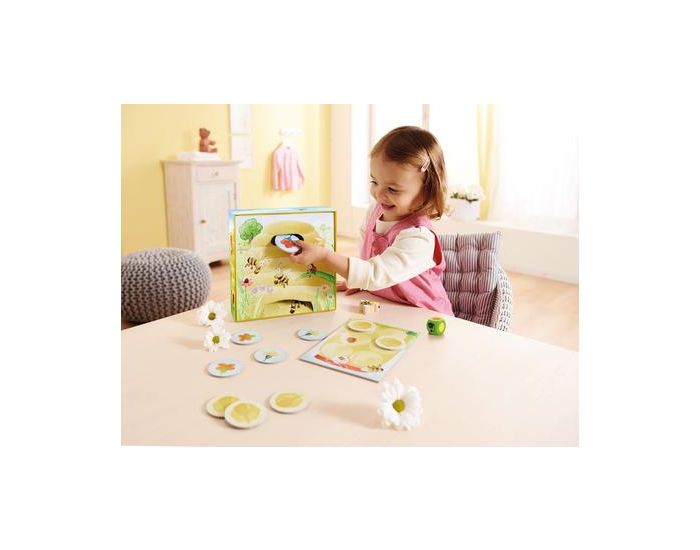 Qui aidera Abella l'abeille à fabriquer autant de miel qu'il faut pour remplir tout le pot de miel, Abella l'abeille fait partie de la collection "Mes permiers jeux" de Haba.