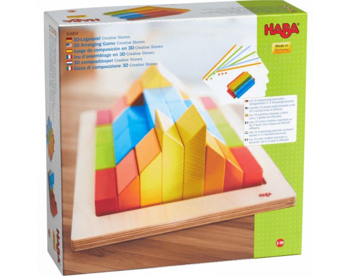 Ces blocs en 3D permettent de créer beaucoup de petites constructions diverses et variées. Que l'on y joue seul ou à plusieurs, il n'y a aucune limite à l'imagination. Les formes géométriques stimulent la perception spatiale et la motricité fine. Les modèles proposent 3 niveaux de difficulté.