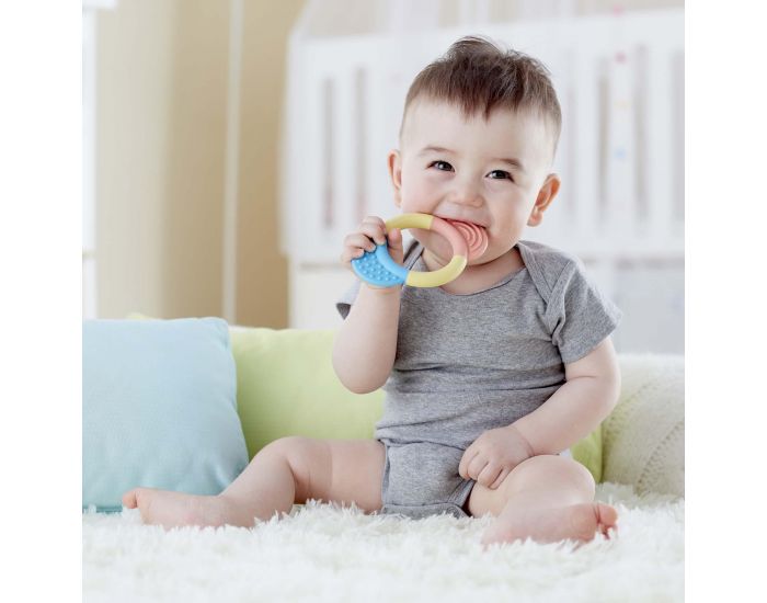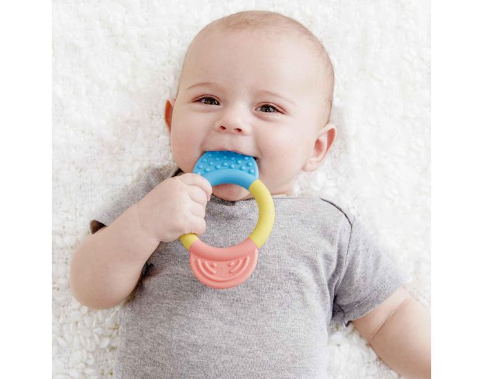 Le fait de mâcher l'anneau de dentition aide bébé lors de la poussée dentaire.