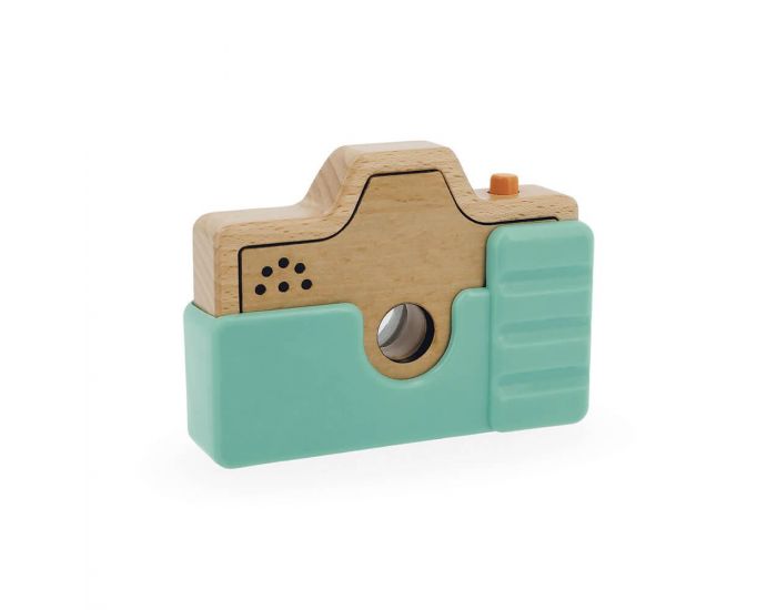 Appareil photo sonore et lumineux, un jouet en bois de la marque Janod. Référence J05381.