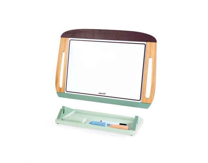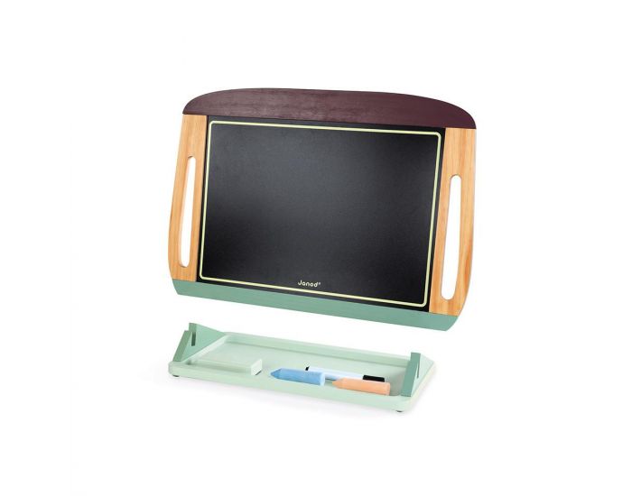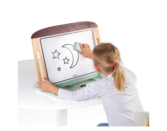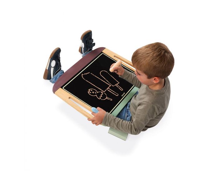 La petite brosse permet de nettoyer les oeuvres des enfants pour pouvoir recommencer à l'infini ! De chaque côté du tableau, on retrouve des poignées permettant de faciliter le transport. Le socle vert anti-dérapant permet de poser l'ardoise sur une table afin d'en faire une utilisation plus verticale. Les artistes en herbe pourront laisser libre cours à leur imagination !