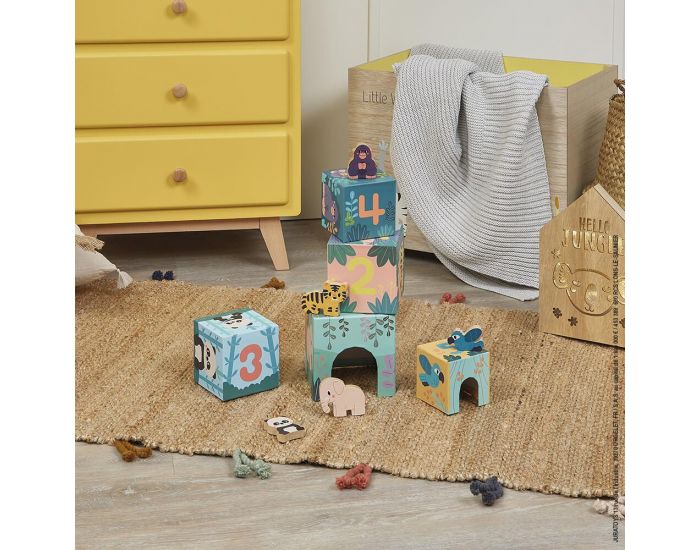 Ensuite, l'enfant pourra s'amuser à retrouver l'habitat de prédilection de chaque animal en bois, mais aussi s'inventer tout un tas d'histoires. Et une fois que l'on a fini de jouer, on range les cubes les uns dans les autres.