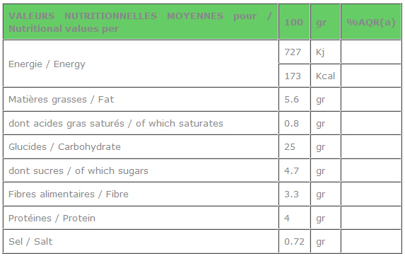 Tableau des valeurs nutriotionnelles :