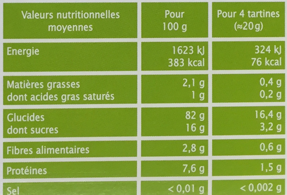 Sans gluten, sans lactose, sans huile de palme, sans sel.
