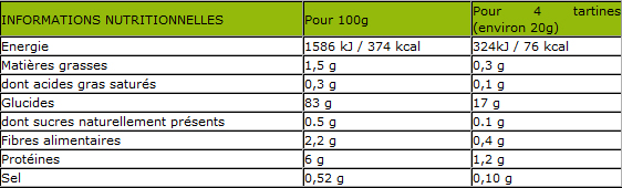 Au parfait mélange de maïs et de riz et sans huile de palme ni lactose, vous pourrez les déguster nappées de beurre, de confiture ou de pâte à tartiner au petit déjeuner, ou bien nature lors du repas ou même les proposer comme toast agrémentés selon votre goût à l'apéritif !