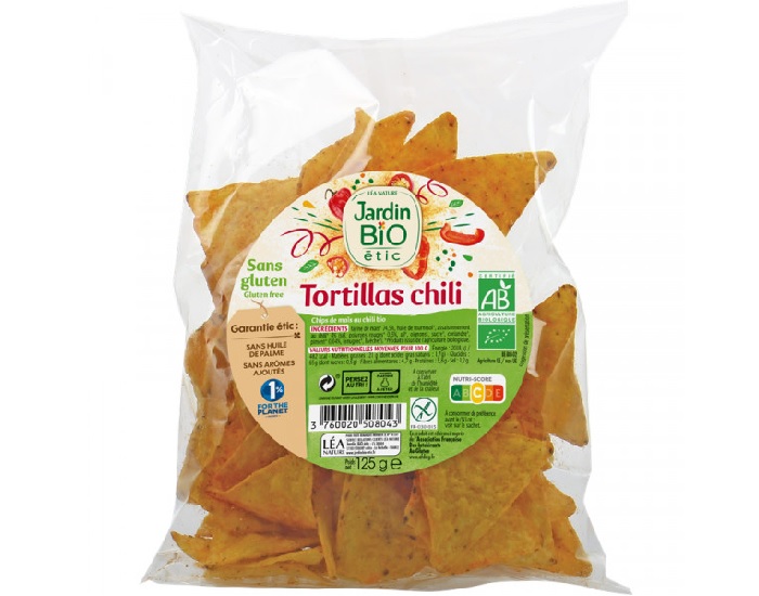 Ingrédients : Farine de maïs* 74.6%, huile de tournesol*, assaisonnement au chili* 4% (sel, poivron rouges* 0.6%, ail*, oignons*, sucre*, coriandre*, piment* 0.04%, fénugrec*, livèche*).