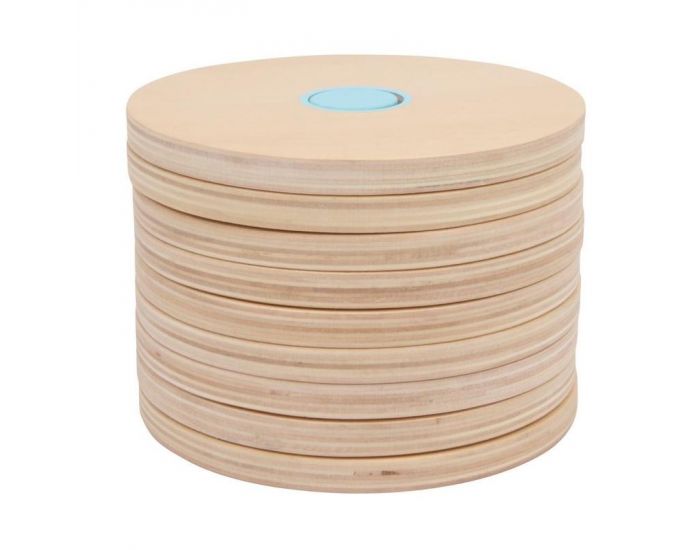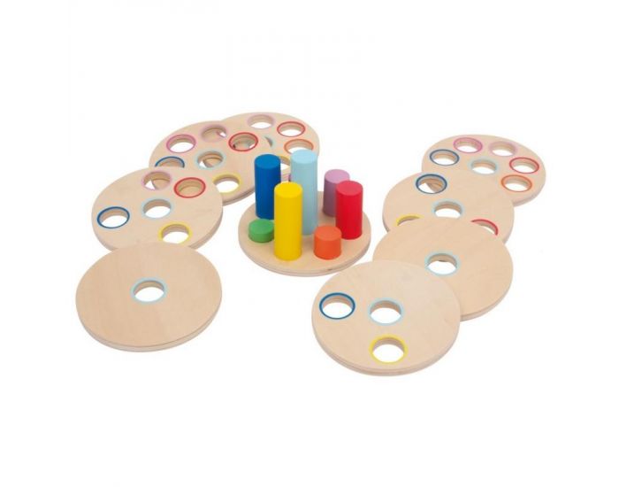 Il s'agit de placer 8 pièces solides (épaisseur 1 cm) en bois stratifié poli sur les cylindres colorés.